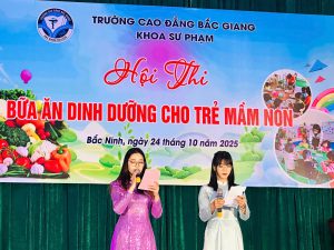 Với mục đích tạo môi trường để sinh viên rèn luyện kĩ năng, nghiệp vụ sư phạm, bồi dưỡng ý thức nghề nghiệp, tạo sân chơi lành mạnh, bổ ích nhằm tăng cường sự hiểu biết cho sinh viên, giúp các em có cơ hội giao lưu, học hỏi, trao đổi kinh nghiệm, đồng thời kích thích khả năng sáng tạo, thúc đẩy phong trào thi đua học tập trong sinh viên; được sự nhất trí của Ban giám hiệu Trường Cao đẳng Bắc Giang; căn cứ Kế hoạch năm học 2025-2026, khoa Sư pham tổ chức “ Bữa ăn dinh dưỡng cho trẻ mầm non”. Đối tượng dự thi là sinh viên năm thứ 2 và năm thứ 3 được chia làm 6 đội thi.